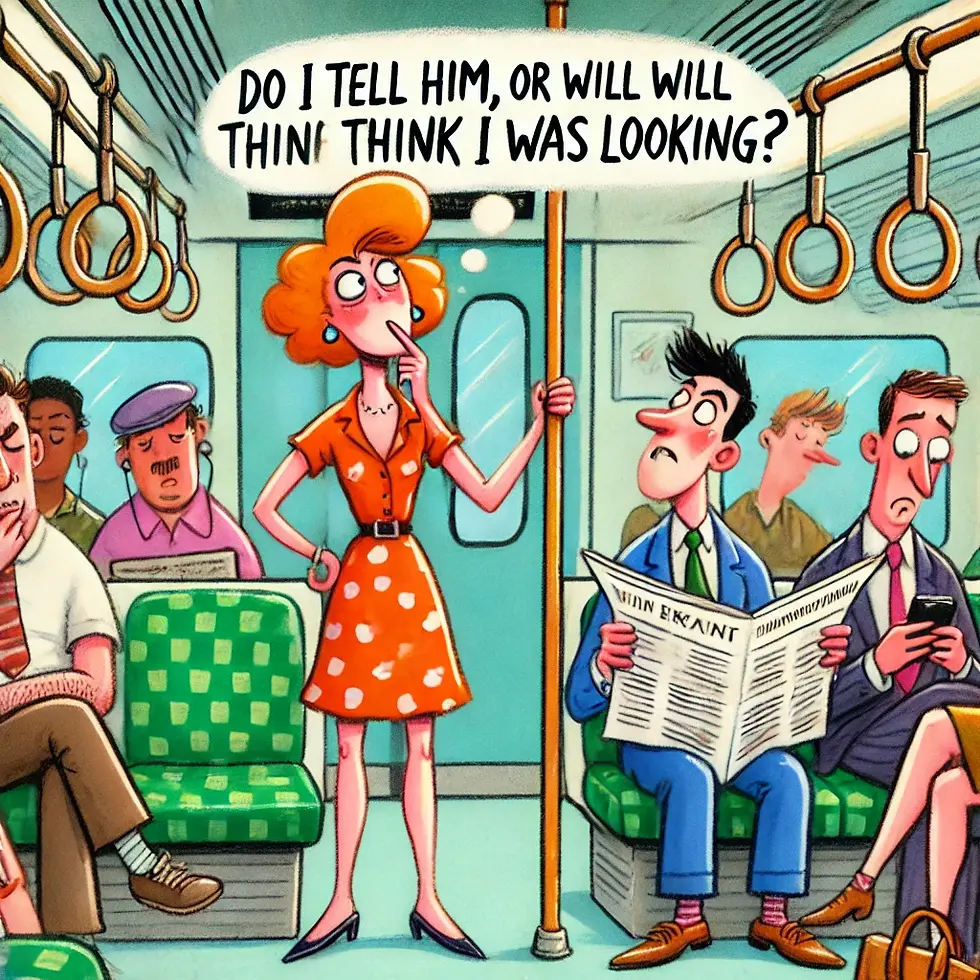 All this thinking about options and he has just stood up to leave the train, I have a few seconds to decide how and whether I tell him. Now or never, do the right thing, or keep your new found knowledge to myself. I've let it go on too long. I've known about it for 5 stops, tell him now he will wonder why I didn't tell him 4 stops ago?